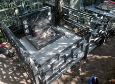 Затем мы заменили ограждение на заранее изготовленную из прямоугольного профиля металлическую оградку. Параллельно мы установили у подножья широкого памятника прямоугольный цветник, собранный из гранитных балок, а также застелили территорию участка геотекстилем, препятствующим прорастанию сорной травы сквозь швы в наземном покрытии.